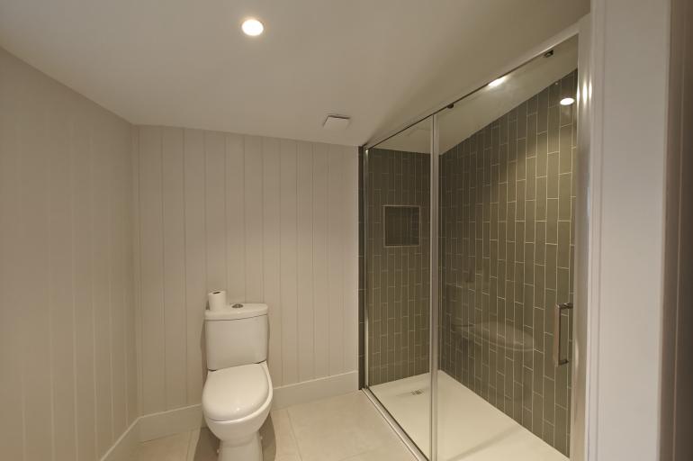 A contemporary family bathroom with a bath and handheld shower completes this floor.