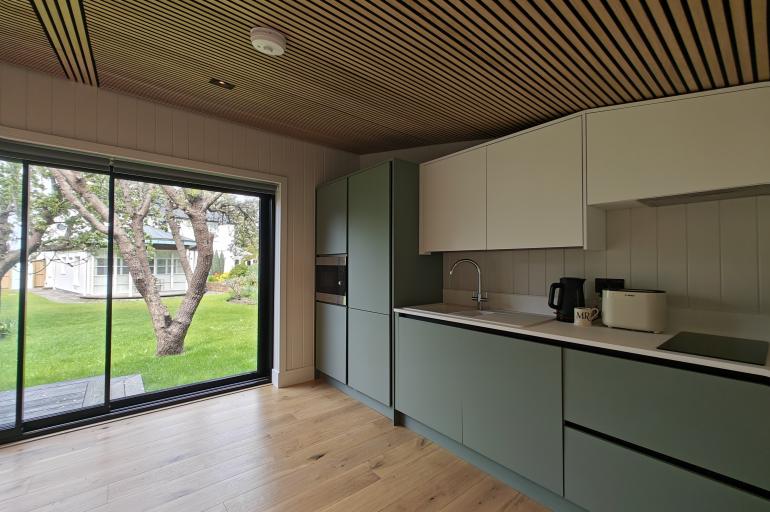 The heart of the home is a spacious, modern kitchen/diner, complete with a sleek central island, large dining table, and direct access to a decked garden terrace — perfect for alfresco meals.