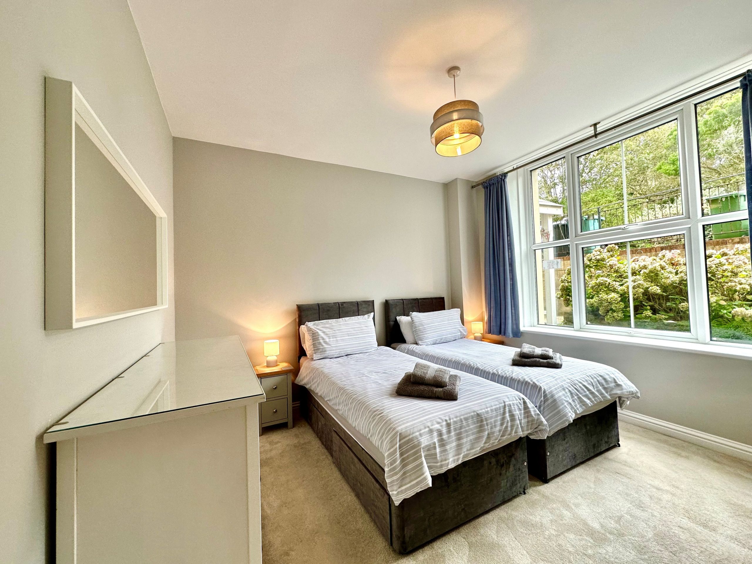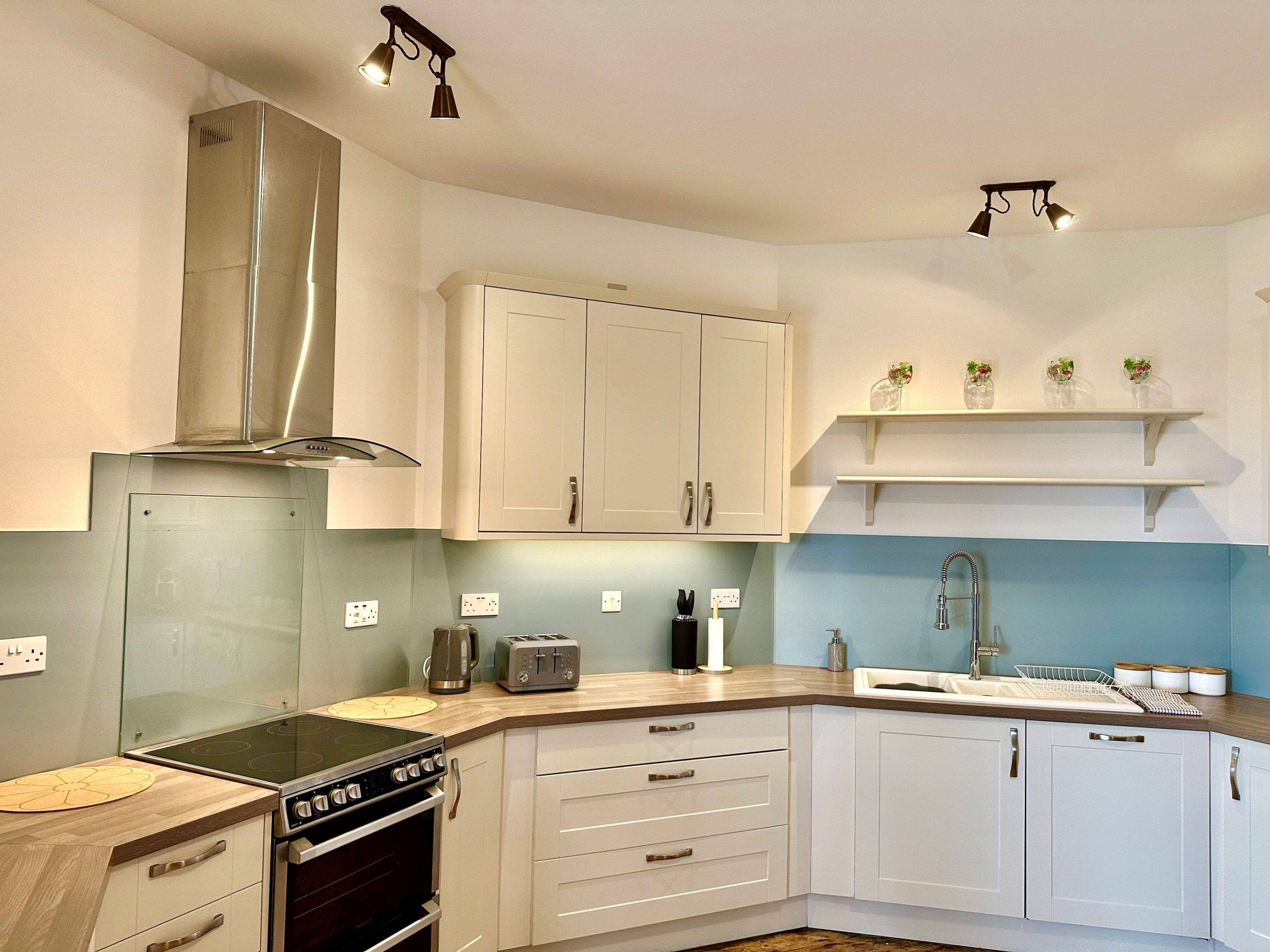 Inside, the property features wooden flooring throughout the living areas, while both stylishly furnished bedrooms offer soft carpeting underfoot for added comfort. Wall-mounted electric heaters ensure a cosy stay all year round. The spacious master bedroom offers a luxurious super king bed, while the second bedroom features twin beds and an open-plan design with an en-suite style shower enclosure, wash hand basin and WC within the room. The main family bathroom is equally impressive, complete with a large bathtub and separate shower enclosure.