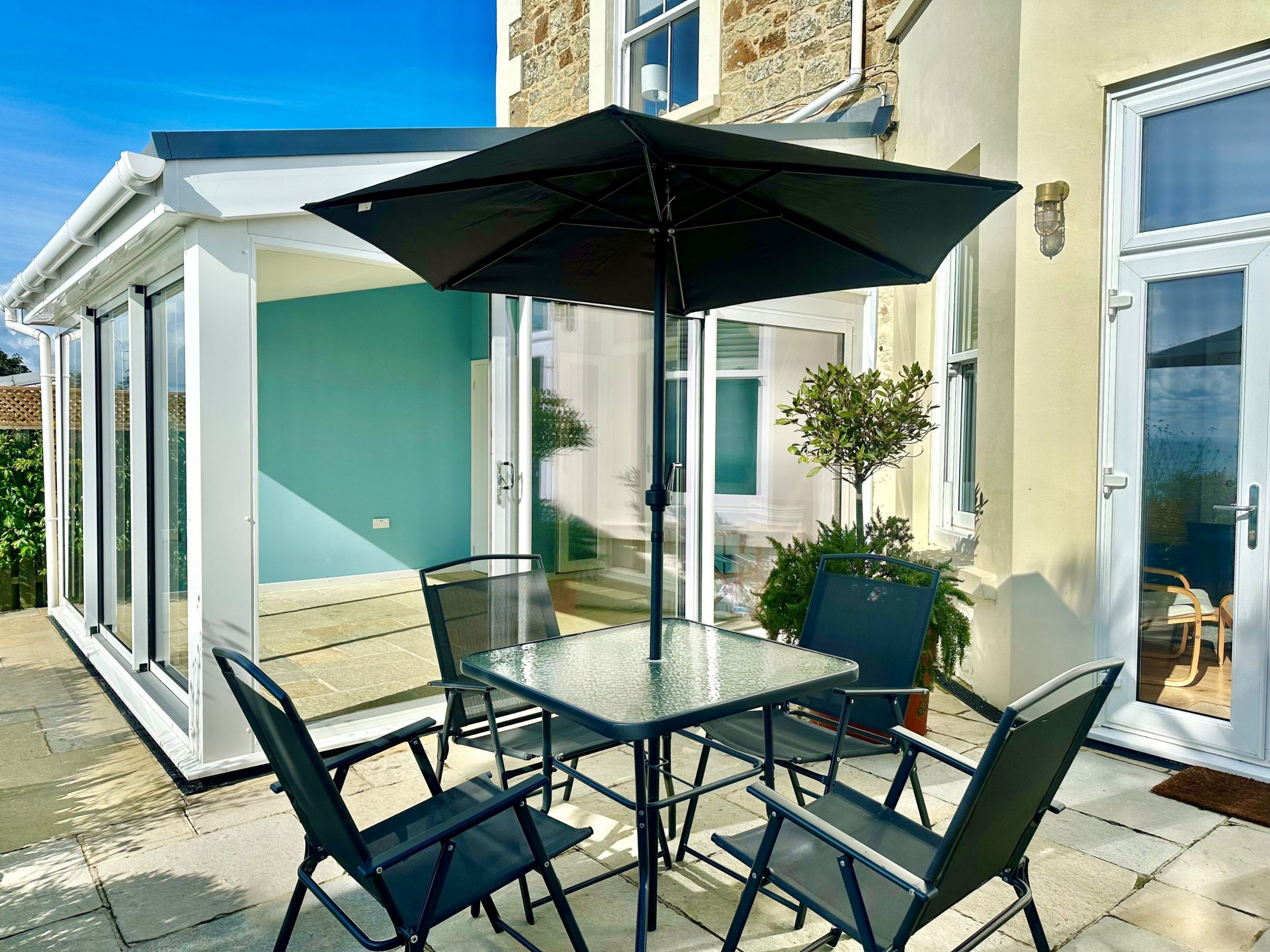 The well-equipped kitchen includes an electric cooker, dishwasher, large Belfast sink, fridge freezer, dining table and seating for four, plus a handy utility cupboard housing a washing machine. There’s plenty of space to prepare delicious meals using fresh Island produce from the local Niton grocery store just a short walk away. French doors lead from the kitchen into a conservatory — a wonderful spot to relax and watch dramatic seas roll in, or, on sunny days, open the sliding doors and step straight onto the terrace to soak up the coastal atmosphere.